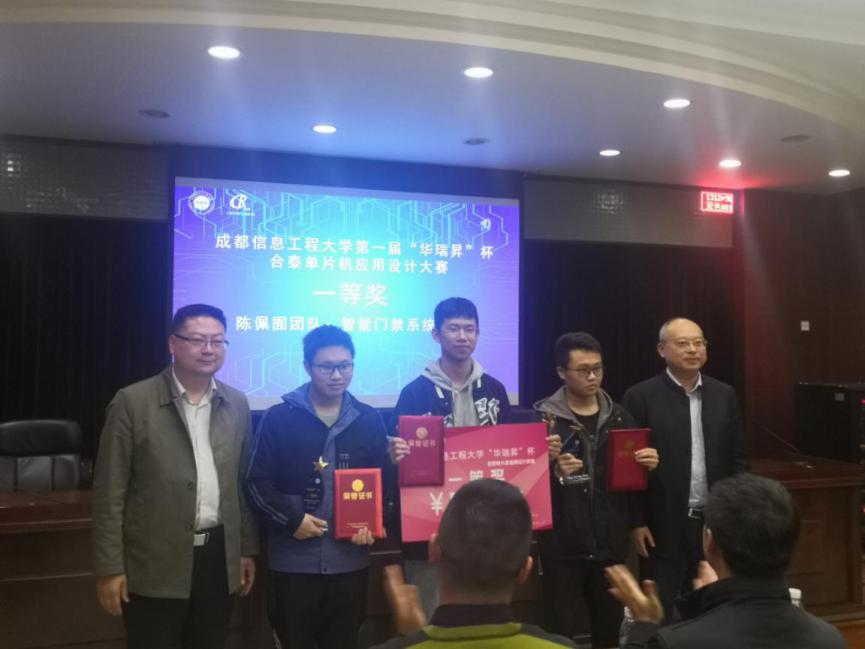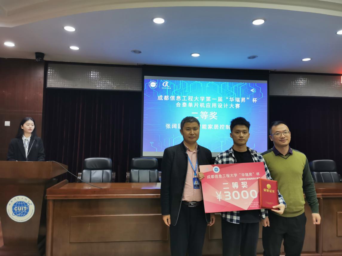 在17日下午的颁奖典礼中,bevictor伟德官网经理李英祥教授以及华瑞昇电子(深圳)有限公司董事长张学斌先生分别对大赛的成功举办致辞。李经理对大赛的成功举办表示祝贺,指出学科竞赛是校企协同,以赛促学的有效育人形式,扎实了员工的理论基础,锻炼了员工的实践能力,增加了员工的竞技经验,提升了员工的综合素质,希望这样的竞赛可以经常性开展,也希望与企业的合作可以纵深发展,多出成果。张学斌董事长对大赛中个参赛团队的精彩表现和取得的成果表示肯定,对各位同学获得的成绩表示由衷的祝贺,并表示作为国内最大的合泰单片机代理和物联网应用开发高新企业,华瑞昇电子(深圳)有限公司将积极在人才培养、实习实训、产品研发、项目攻关等多个层面与公司开展合作,打造优质高效的创新创业人才培养基地和产品孵化平台。随后,两位领导为华瑞昇电子(深圳)有限公司作为公司老员工创新创业实践基地共同揭牌。