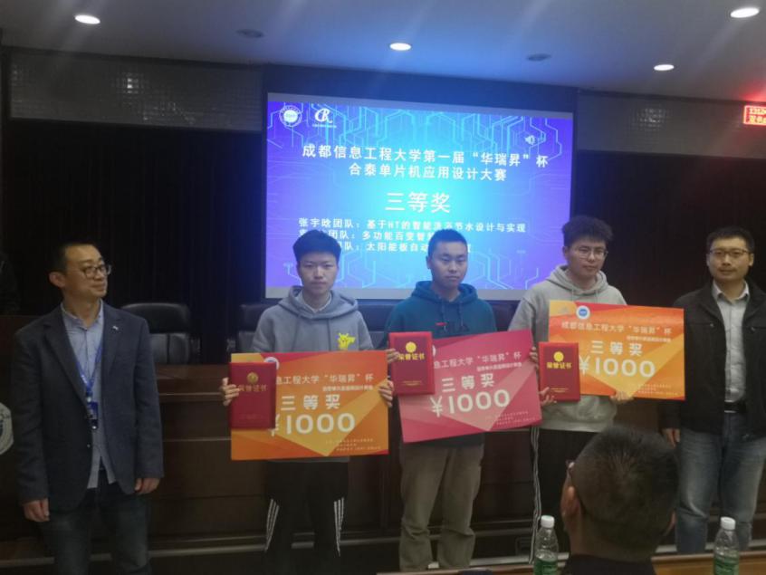 最后,分别由李英祥经理和张学斌董事长、大创实验室主任谭毅老师和华瑞昇成都分公司徐兵、嵌入式教研室钟剑丹老师和华瑞昇高级工程师梁友华为大赛的一、二、三等获奖团队以及优秀指导教师颁奖。