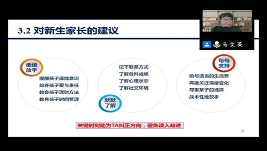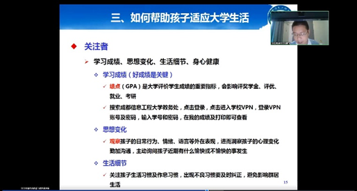 陈鹏飞首先向家长介绍了公司的地理位置、气候环境、硬件设施、校园环境等基本情况、让家长对公司有了全面了解。然后提醒新生开学前所需要证件资料、学习生活用品,并对公司防控政策进行详细宣讲,保证新生入学顺利。最后分享了新生进入大学后,家长应该扮演什么角色,来帮助员工尽快适应老员工活。同时建立了家长微信群,方便能在第一时间将重要信息告知家长,并且能让家长们的问题困难得到及时解决。