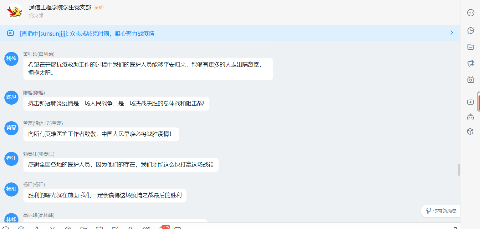 紧接着,全体党员通过线上发言针对活动内容展开讨论,其中员工党员颉逸飞同志表示:“乌云遮不住太阳,阴霾终究会散开,唯努力不会被辜负。我们有理由坚信:有以习近平同志为核心的党中央的坚强领导,有全国上下的同舟共济,科学防治,精准施策,我们就一定能打赢这场疫情防控阻击战。”