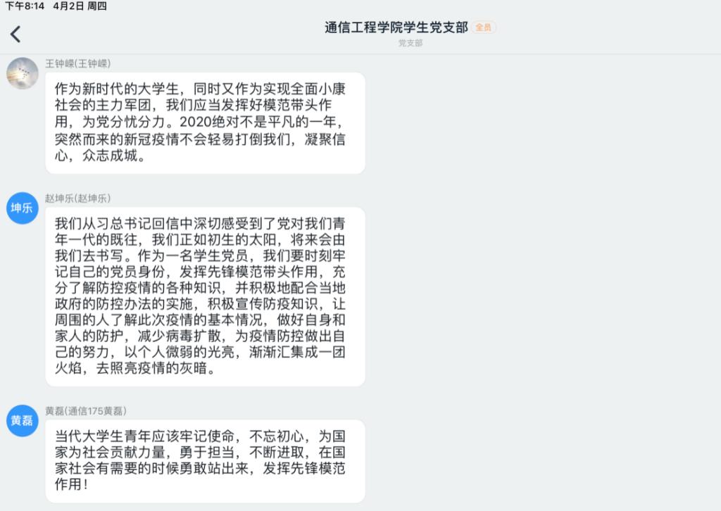 本次活动的内容以线上学习的方式,学习习近平总书记给北京大学援鄂医疗队全体“90后”党员回信并进行讨论,为打赢此次疫情防控阻击战贡献青春力量。其中刘成龙同志表示:“这是中国人民的一次伟大战役,这是是一场保卫人民群众生命安全和身体健康的严峻斗争,这亦是中华儿女为国争光的光荣时刻。90后会成为未来有担当的一代,有责任意识的一代,加油中华儿女,疫情不会让我们后退!”